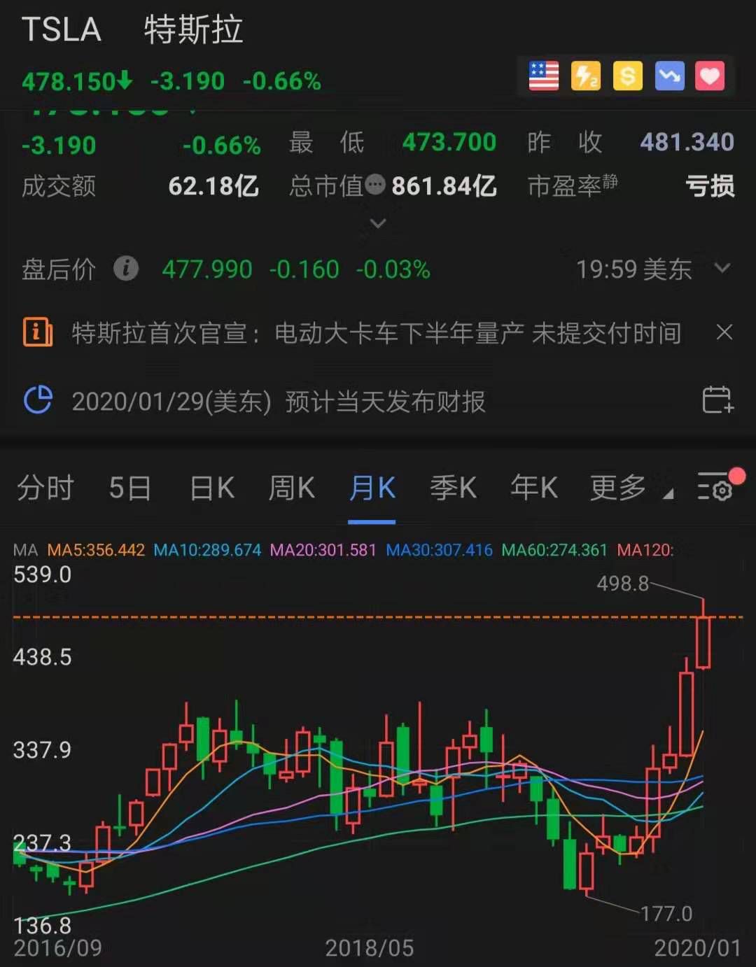近期特斯拉发布的财报显示,该公司各项指标均创公司纪录新高,且好于市场预期,特斯拉股票持续处于高位上涨的态势。其中1月8日,特斯拉股价涨至492.14美元,较一个月前上涨超30%。