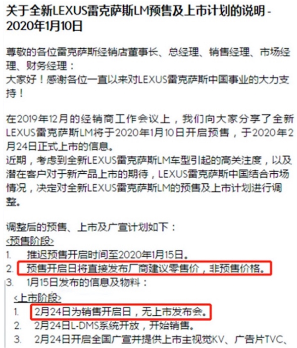 一直存在“加价”舆论的雷克萨斯,早在去年上海车展就已经推出了旗下首款旗舰MPV车型——雷克萨斯LM,新车基于丰田埃尔法升级打造而来,定位比后者更加豪华。近日我们从相关渠道获悉,原定于1月10日公布预售价的雷克萨斯LM突然“跳票”,预售日延期至本月15日,同时将公布新车正式售价,正式销售时间依然为2月24日。