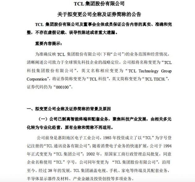TCL集团正式申报,更名为TCL科技集团。TCL集团更名为TCL科技集团(以下简称TCL)在意料之外,也在情理之中。2019年,TCL经历了一次重大变革,完成了重大资产重组交割,把智能终端和相关配套业务从上市公司剥离,交给TCL实业控股,而那个在A股上市,我们熟知的老牌家电企业则摇身一变成为一家聚焦半导体显示及材料的公司。