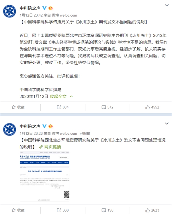 第二条微博刊登了中国科学院科学传播局关于《冰川冻土》期刊发文不当问题的说明: