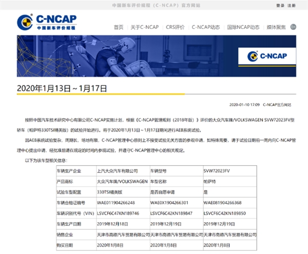 据悉,帕萨特将于2020年1月13日-1月17日进行AEB试验,也就是春节前。2月份时候会进行结构碰撞试验,也就是春节后。