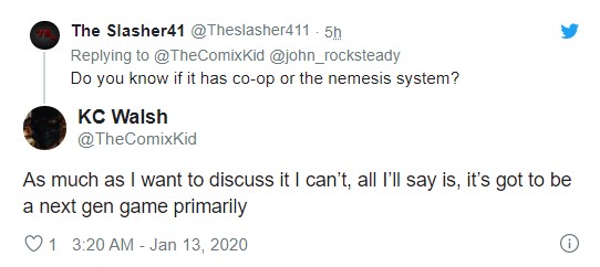 推特上有玩家问道:“这款新作有没有多人合作系统,或者是复仇系统?”KC Walsh回答道:“虽然我也想告诉你,但是不行,我只能说,这款新作将首先面向次世代主机开发。”