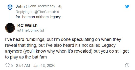 尽管没有太多关于这款游戏的消息,但KC Walsh表示这款游戏会让玩家感到惊讶,当有玩家问到这款新作是《蝙蝠侠:阿卡姆起源》还是《蝙蝠侠:阿卡姆骑士》的续作时,KC Walsh说,新的“阿卡姆”游戏可能是该系列的重启。