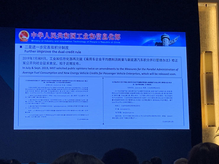 2019年的7月和9月,我们两次就乘用车企业平均燃油消耗量与新能源汽车积分并行的管理办法修订案公开征求了意见,同时根据社会各方面反馈的意见进行了修改完善,准备在近期就要发布。