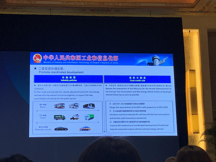 我们将联合有关部门进一步研究评估新能源汽车补贴退坡政策,支持公共领域用车率先实现电动化,要尽早发布双积分的管理办法,要结合行业发展新情况,科学合理的设计2021到2023年新能源汽车积分比例的要求。