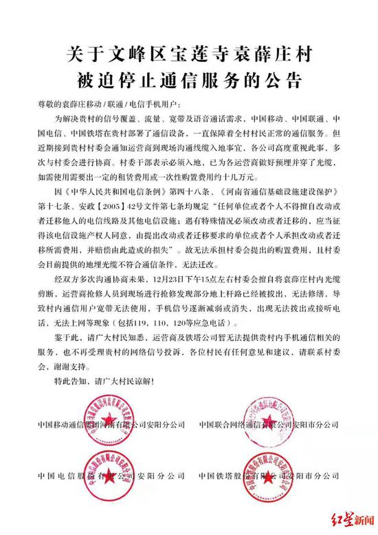 运营商的公告对于事件的细节描述更为丰富:“为解决位于河南省安阳市文峰区宝莲寺袁薛村的信号覆盖、流量、宽带及语音通话需求,中国移动、中国联通、中国电信以及中国铁塔公司为其部署了通信设备,一直保障该村正常的通信服务。但近期接到贵村村委会通知运营商到现场沟通线缆入地事宜,各公司高度重视此事,多次与村委会进行协商。村委干部表示必须入地,已为运营商做好预埋并穿好了光缆。如需使用需要出一定的租赁费用或一次性购置费约十几万元。”