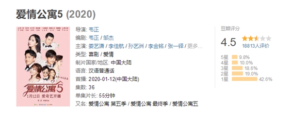 《爱情公寓5》已于昨日起在爱奇艺正式开播,每周日至周二20点各更新2集,会员抢先看一周(6集),最快1月28日就能看到大结局。今天,最新的豆瓣评分已经出炉,超1.8万人参与了评价,评分仅4.5。有超过42%的观众给了一星评价,而五星不到10%。