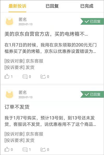 目前,观察者网在某投诉App上看到,因在京东使用优惠券低价购买小家电后未发货的投诉案例已有多起,投诉者均称京东有虚假宣传、欺骗消费者的嫌疑。