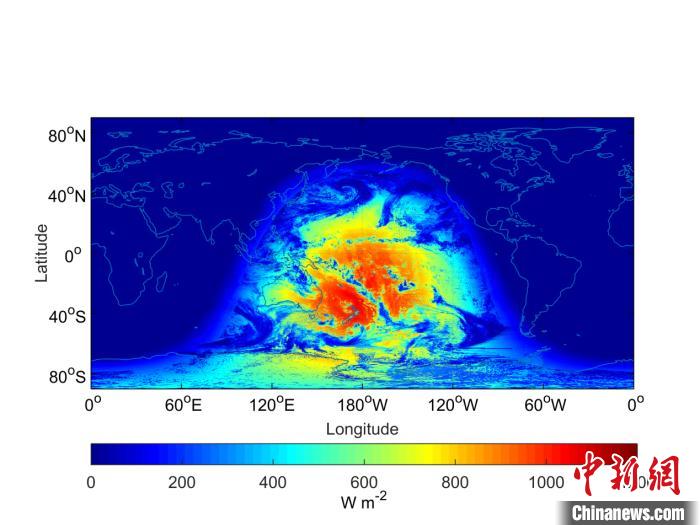 2009年1月1日0时(世界时)全球太阳辐射空间分布,红色对应太阳辐射高值区,蓝色对应云多的地区或者没有阳光的地区。中科院青藏高原所/供图