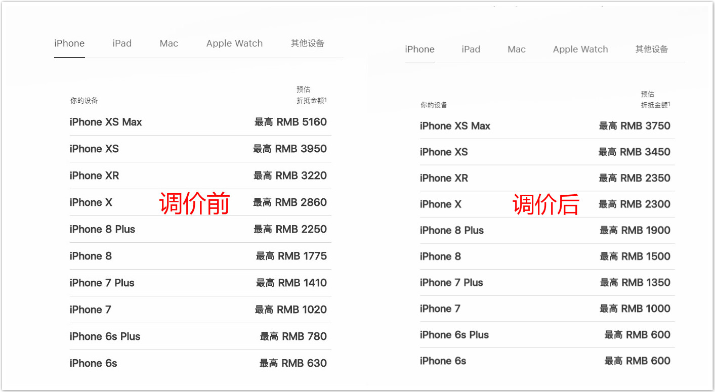 最近苹果悄然下调了“Apple Trade In 换购计划”的设备估价,涉及的种类包括 iPhone、iPad、Mac、Apple Watch 等。下调幅度最高的设备为 iPhone XS Max,由此前最高的 5160 元下调至 3750 元,跌了将近 1500 元,其他设备也均有不同幅度的下调: