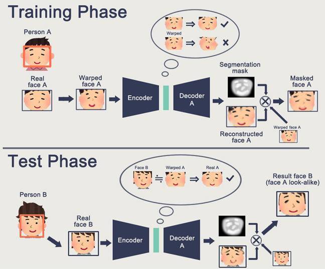 不同于 Cycle GAN,Deepfake 是一种深度自动编解码器模型(Autoencoder-Decoder),通过用源人物和目标人物的至少几百张照片,训练模型分别识别、还原两人面部的能力,最后用源人物的照片搭配目标人物的解码器,从而完成转换。