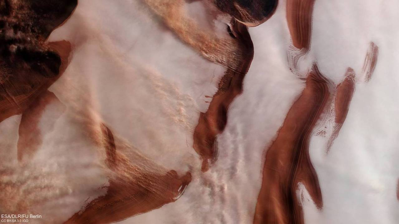 由于照片中的云层非常小,所以这意味着大家可以在照片中看到很大一部分的冰层和红色风景。照片中呈现螺旋状图案的部分则由重力风造成。ESA表示,重力风利用重力将干燥寒冷的空气向下移动到更温暖的地区。