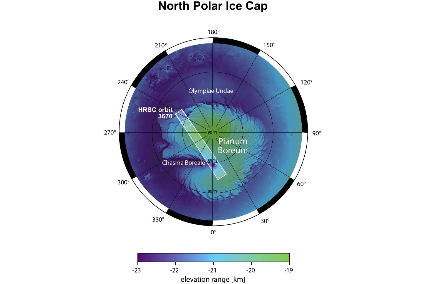 Mars Express的高分辨率立体摄像机(HRSC)捕捉到了这张令人惊叹的火星北极照。