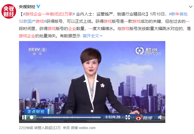 2020年1月10日,新年首批总计52款国产游戏过审获得版号,标志着2020年游戏审批工作的启动。而央视财经频道在昨晚对国内游戏企业环境进行了聚焦,认为游戏版号发放数量的缩水,所导致游戏企业一年倒闭近2万家,是监管趋严,倒逼行业精品化的体现。