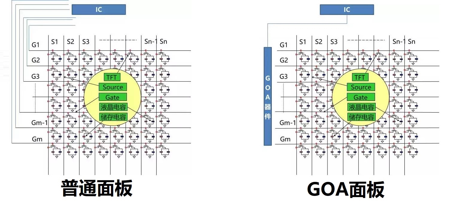 上图显示出了普通面板与GOA面板的区别,可以看到普通面板使用Gate线连接到IC,边框线路非常密集,要占用大量空间。