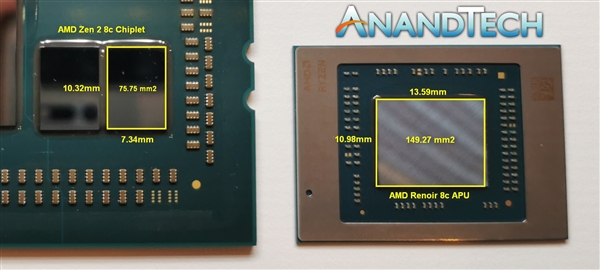 AMD近日正式发布了锐龙4000U、锐龙4000H系列移动APU(代号Renoir),采用7nm工艺、Zen 2架构,最多八个CPU核心、八个GPU计算单元(512SP),热设计功耗15/45W。发布会后,AnandTech参观了AMD的展台,惊喜地发现了锐龙4000 APU的裸片,旁边还摆着64核心128线程撕裂者3990X的裸片,于是测量了一下它们的核心面积。