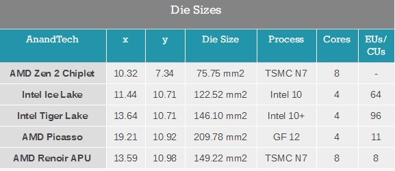 10nm+工艺的Intel Tiger Lake面积为146.10平方毫米,有四个CPU核心、96个GPU单元(当然AMD/Intel GPU单元没有直接可比性)。