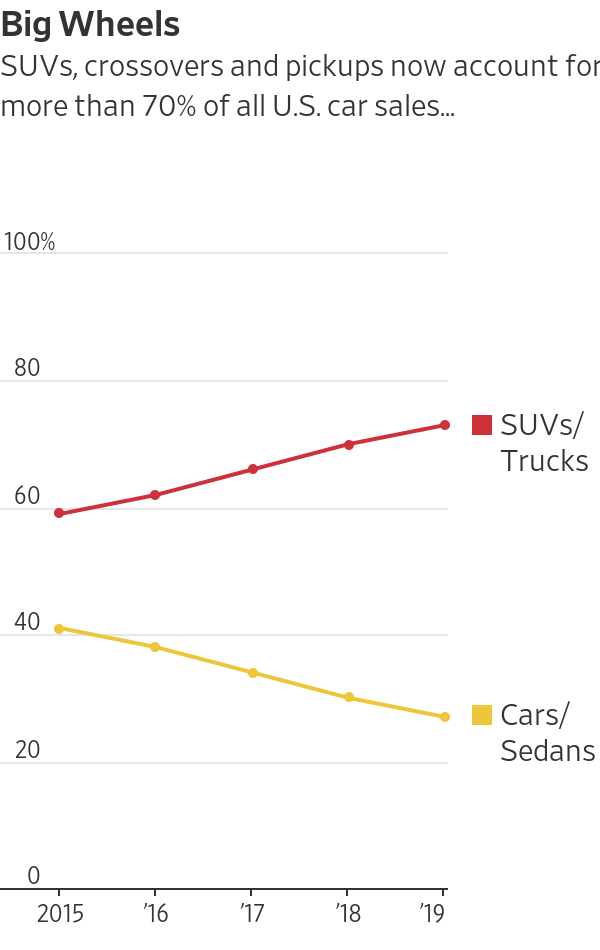 图示:SUV、跨界车和皮卡目前占美国汽车总销量的70%以上。