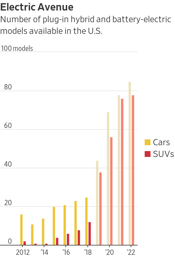 根据全球咨询公司艾睿铂(AlixPartners)的预测,到2022年,市场上将有78款插电式混动以及纯电动SUV可供消费者选择,高于去年的38款。相比之下,2015年市场上只有4款同类车型。分析师还预计,未来两年内约有六款电动皮卡将面市。其中既有插电式混合动力汽车,也有全电动车型。