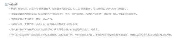 付费图文必须为原创文章,文章设置为“付费图文”时,默认一同声明原创,若原创声明失败,文章则不能以付费图文形式群发。付费图文暂不支持转载、赞赏、插入广告。