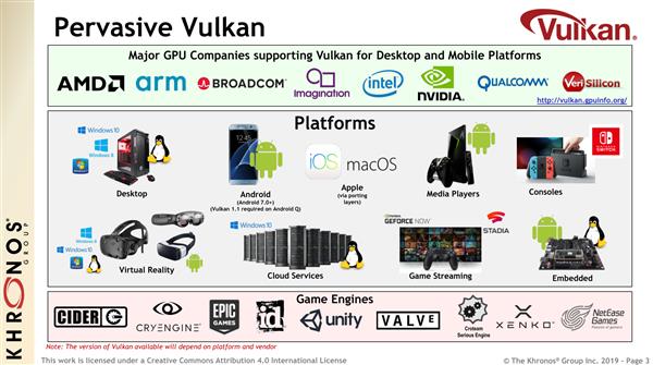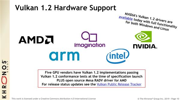 Vulkan 1.2虽然是新规范,但不需要全新的硬件,之前支持Vulkan 1.1的GPU硬件都可以兼容,目前NVIDIA、AMD、Intel及ARM、Imagination等五家公司的硬件已经通过了兼容性认证。