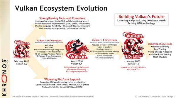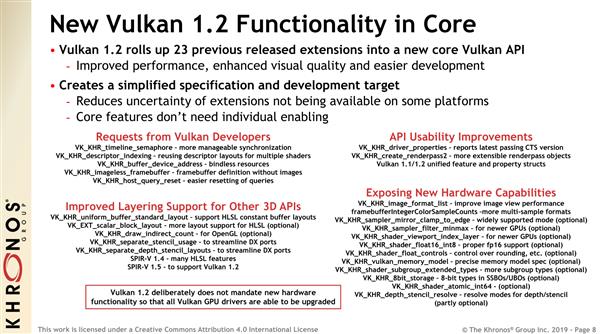 2019年3月份推出Vulkan 1.1规范之后,Khronos今晚又推出了Vulkan 1.2规范,在原有版本上增加了23项功能扩展,同时保持GPU兼容,NVIDIA、AMD、Intel及ARM、Imagination这五家公司已经支持了新规范,NVIDIA今晚还率先发布了新的GeForce驱动支持Vulkan。
