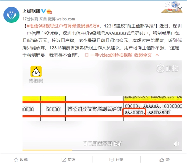 据媒体报道,近日深圳一位电信用户投诉称,深圳电信座机9级靓号AAABBBB式号码过户,强制新用户每月低消5万元。投诉用户称,这个号码目前月租20多元,本想过户给朋友,听到低消只能放弃。