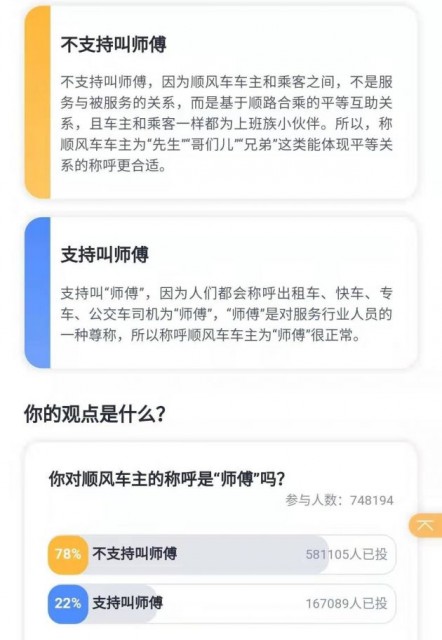 1月16日消息,顺风车行业标准课题研究集思会第五期针对“ 您会称顺风车主为师傅吗”这一议题进行讨论,近450万网友参与集思,近七十五万人在嘀嗒出行平台上参与投票,根据投票结果,不支持叫师傅的占78%。从网友的讨论来看,不支持叫师傅的主要理由有以下几方面: