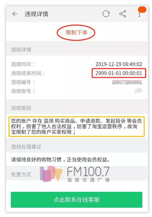 从朱先生提供的截图中,小七鲜生看到,违规详情页面下写着“限制下单”,违规时间是2019年12月29日8点49分,违规结束时间是2999年1月1日。违规原因是“账户存在滥用购买商品、申请退款、发起投诉等会员权利,侵害了他人合法权益,妨害了淘宝运营秩序,故淘宝限制了账户买家权限”。