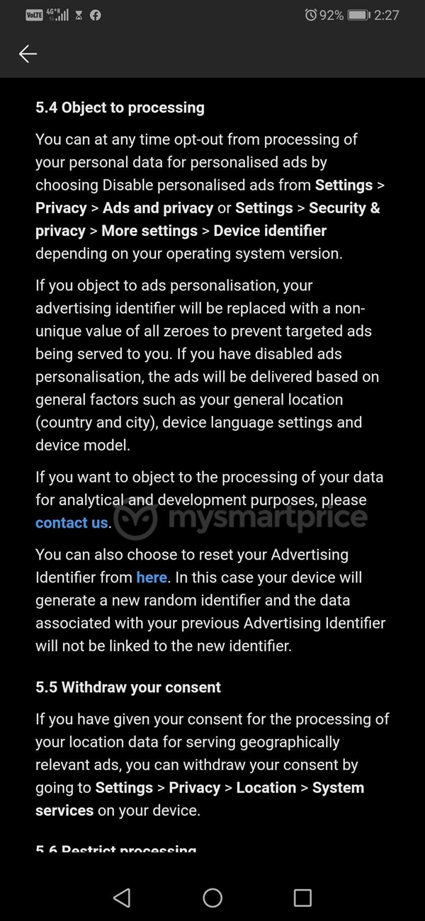 条款提到,“华为广告”平台将保留用户的个性化数据一年的时间,地点是位于中国香港和新加坡的服务器。如果用户同意的话,华为广告平台还会基于地理信息推送相关广告。另外,埃及、墨西哥、印度、韩国、巴基斯坦的用户数据可能会存储的对应的本地服务器中。