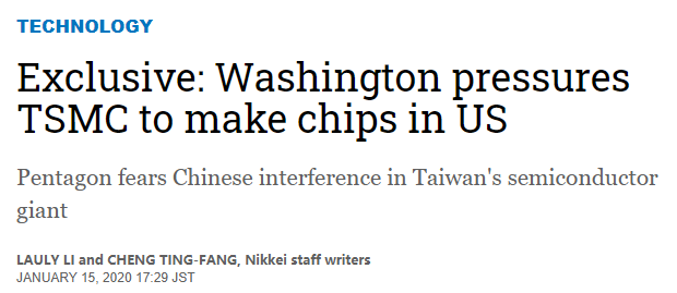 《日本经济新闻》透露,1月11日台湾地区领导人选举前,美国政府官员已经多次与台积电进行沟通。2019年年底,美国商务部副助理部长史宜恩(Ian Steff)“访台”期间,还与台积电创始人张忠谋、董事长刘德音进行了一次闭门会谈。