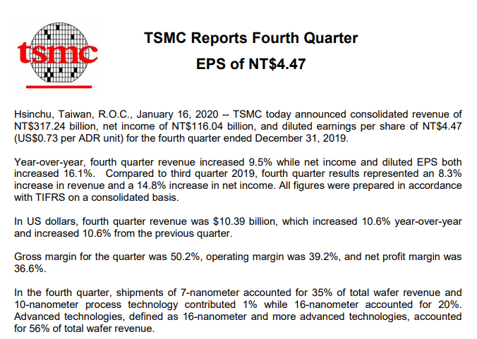 台积电目前在全球芯片代工市场具有绝对优势——市占率达到了50%左右。此外,包括华为在内的中国大陆企业,占台积电营收约两成;而北美市场为台积电贡献了约60%的营收。今天台积电方面也公布了2019年四季度财报,当季台积电营收103.9亿美元,同比环比均增长10.6%;当季台积电毛利率为50.2%,净利率为36.6%。