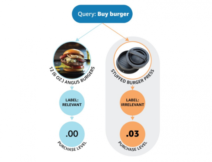 举个例子,人工注释员会将“购买汉堡”的词条与汉堡产品联系起来,而不是将该词条与“汉堡机”联系起来,但亚马逊发现,发出“购买汉堡”这一指令的用户可能会买看似无关的汉堡机,并不会买真正的汉堡。