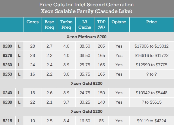 L系列则有28核心铂金8280L/8276L、24核心铂金8260L、16核心铂金8253L、18核心金牌6240L、22核心金牌6238L、10核心金牌5215L,即日起全部降价,降幅从27%到54%不等,其中旗舰级铂金8280L 17906美元降至13012美元,最低端的金牌5215L则从9119美元降至4224美元。