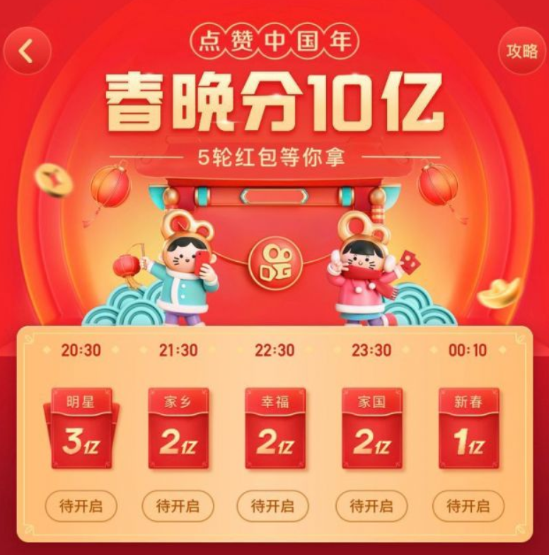 第二轮点赞家乡情,将发出2亿元现金,其中包括100万个88.8元锦鲤红包。第三轮点赞幸福年发放2亿元现金,其中有10万个666元红包。第四轮点赞家国梦准备了2亿元,将产生10万幸运儿收获888元红包。