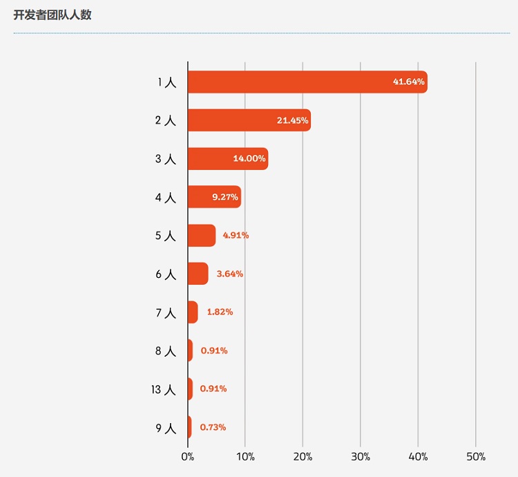 该组数据出自Indienova《国内独立游戏开发者报告2019》。从数据上看,独立团队3人以下是绝对主流,总占比达到77.09%,是最常见的生态。而且低人数团队成员往往身兼数职,《报告》还指出,Indienova社区开发者职能前三分别是程序、策划和美术,均为研发岗,运营岗只占6.53%。引擎方面也多选择比较灵活的Unity,发售平台也是更少限制的Steam。