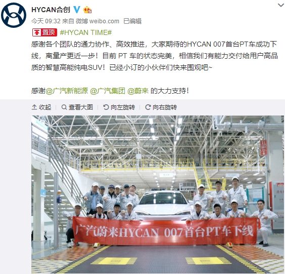 去年12月底,广汽蔚来旗下HYCAN合创品牌发布了首款纯电动SUV——HYCAN 007,新车预售价区间为26-40万元,根据配置不同其NEC续航里程为523或643公里。今日我们从官方获悉,HYCAN 007 PT样车正式下线,预计今年4月开始正式上市并交付用户。