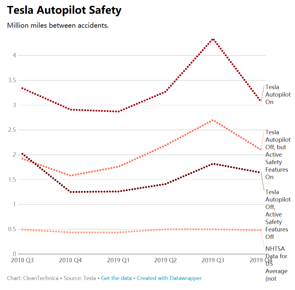 1月16日,特斯拉汽车在其官网发布了2019年第四季度汽车安全报告,报告显示,特斯拉汽车的安全性相较于美国公路上的其它车辆,特斯拉电动车更安全,并且事故平均里程要比其他车辆高出三、四倍。