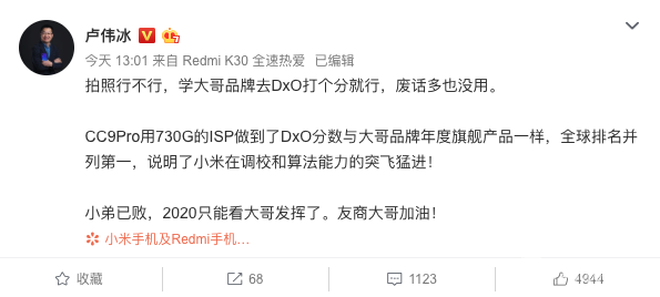 以往厂商送测DxOMark大多希望在其手机相机排行榜获得好的名次,达到手机拍照宣传的效果,如今荣耀V30 PRO相机评分出炉背后还有一些别的故事。近日,Redmi荣耀两家高管在微博频发“口水仗”,荣耀业务部副总裁熊军民认为“亿级像素方向错了”,而小米集团副总裁卢伟冰则直言“拍照行不行,学大哥品牌去DxO打个分就行,废话多也没用”。