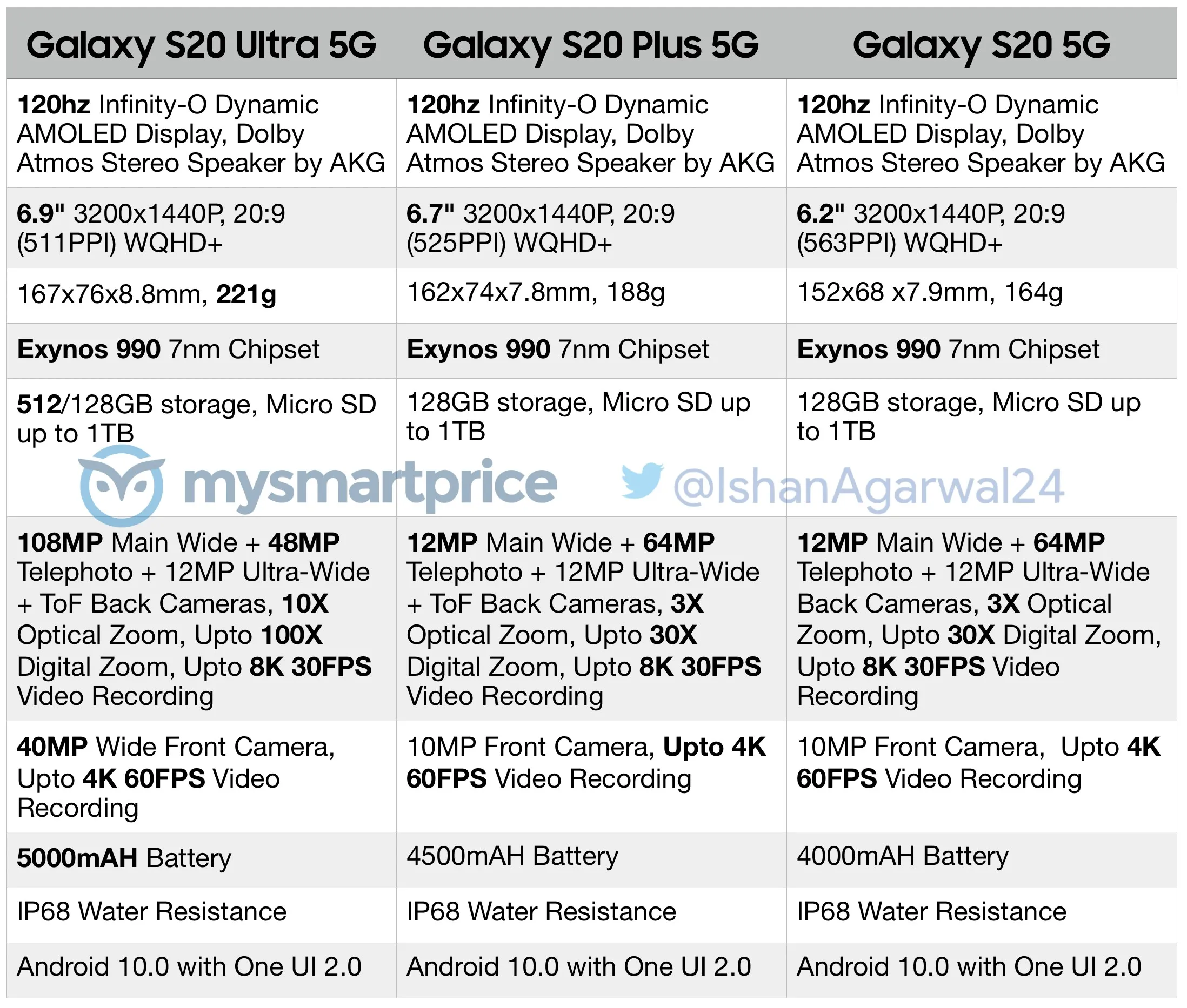 1月18日消息,mysmartprice公布了Galaxy S20系列的完整规格。Galaxy S20系列包含Galaxy S20 Ultra、Galaxy S20 Plus和Galaxy S20等,三款都提供5G版本,其中Galaxy S20 Ultra有且仅有5G版本。