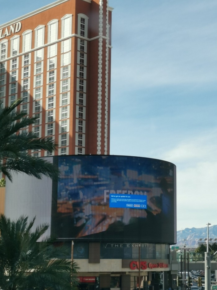 1月18日消息,知名爆料人士@Roland Quandt在拉斯维加斯拍摄到了有趣的一幕。在TREASURE ISLAND酒店下一个巨大的荧屏广告牌上,Win10系统弹窗提示有新更新可用,是否要升级?体验过Windows 10系统的用户应该感同身受,Windows 10系统时不时弹窗提示更新。