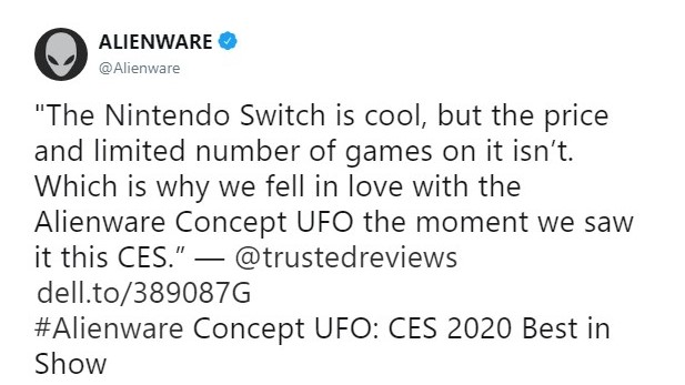 外星人官方推特:任天堂Switch确实很酷,但是NS的游戏数量和价格就不是那么给力了。这也是我们在CES上一看到“Concept UFO”就立马爱上它的原因——来自Trusted Reviews。