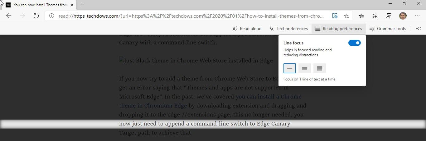 在“阅读视图”工具栏上的“阅读首选项”下提供了一个新的“行焦点”选项,让在浏览器上阅读的用户可以一次专注于一行、三行或五行文本。