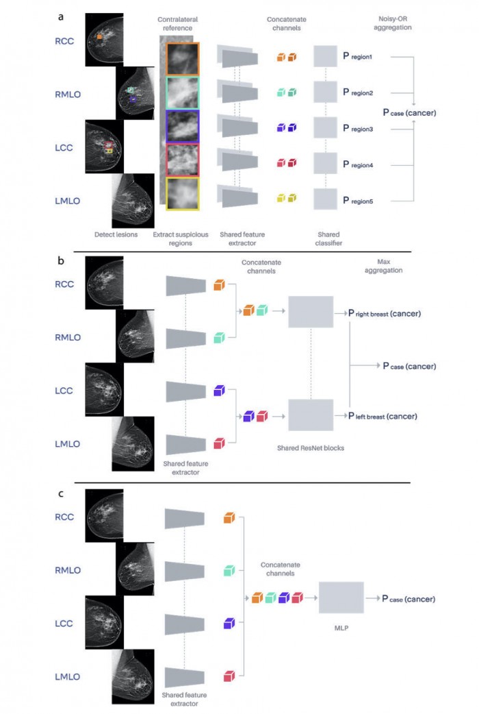 图:谷歌的健康部门团队、DeepMind部门和伦敦帝国理工学院使用了三个不同的深度学习神经网络,从上到下分别是Facebook AI的“RetinaNet”与谷歌的“MobileNetV2”结合体,中间部分是ResNet-v2-50,最后底层的ResNet-v1-50。每个神经网络都以不同的方式挑选出乳房X光照片中看起来可疑的区域,然后对发现进行汇总,以得出关于癌症或非癌症的概率决定
