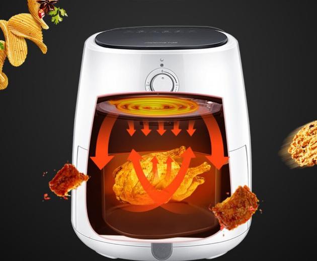 一般的空气炸锅通常采用顶部加热,配合专利高速空气循环技术,通过热风在密闭的锅内形成急速循环的热流,用空气替代原本煎锅里的热油,让食物变熟;同时热空气还带走了食物表层的水分,从而达到近似油炸的效果。
