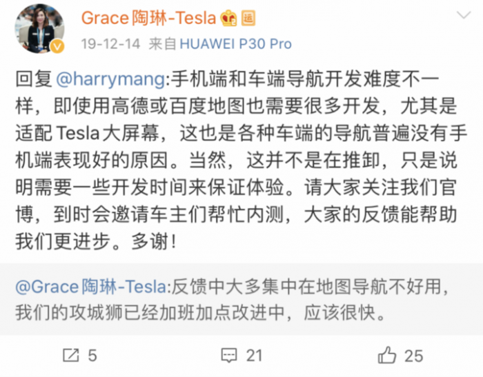 特斯拉对外事务副总裁陶琳在微博上针对此事回应称:内部工程师正在加班加点进行改进,还表示“手机端和车端导航开发难度不一样,即使用高德或百度也需要很多开发,尤其是适配 Tesla 大屏幕”。