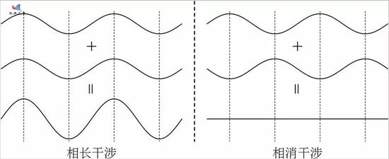 光有一种性质——同处一处的多条光波会相互叠加自身的强度。这样的现象叫做“干涉”,是一种“同相更强,反相相消”的效果:如果一束光的峰值和另一束光的峰值叠加在一起,结果就会变得更强; 而如果一束光的峰值和另一束光的谷值叠加在一起,结果就会相互抵消。这两类现象分别叫做“相长干涉”和“相消干涉”。