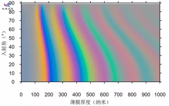七彩的肥皂泡不仅仅可以欣赏,我们其实还可以从泡泡的色彩上推断它的厚度。计算机模拟的结果表明,泡泡表面反射光的颜色,和入射光的入射角、以及薄膜厚度的关系图,也像一条绚丽的彩虹。