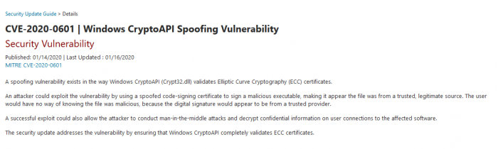 在最新公告中,微软承认CVE-2020-0601带来的高危影响,并表示Windows CryptoAPI(Crypt32.dll)中用于验证椭圆曲线密码学(ECC)证书的方式中存在一个欺骗漏洞。黑客利用该漏洞可以签署任意恶意可执行文件,将其伪装成为受信任的合法来源。微软表示:“成功利用此漏洞还可以使攻击者进行中间人攻击并解密机密信息。用户与受影响软件的连接。”