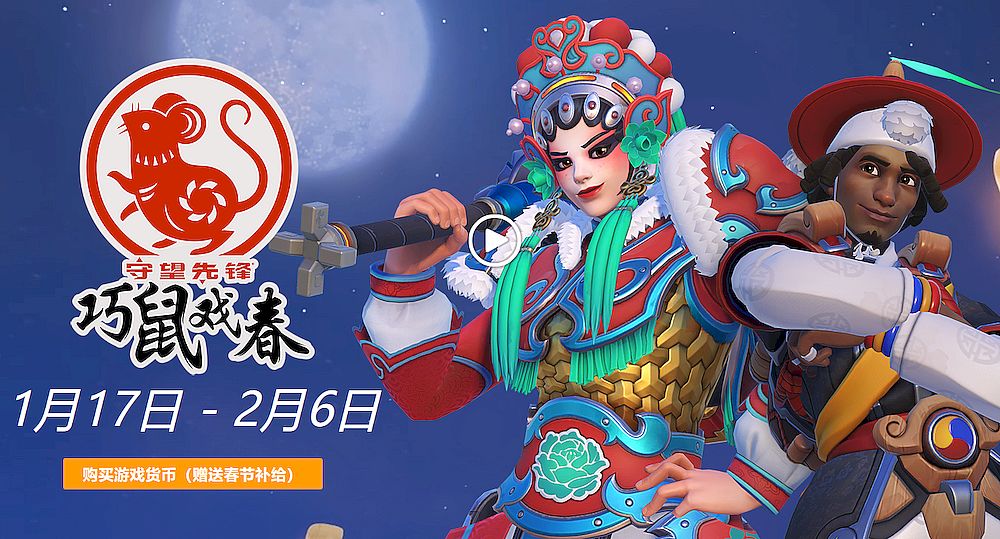 为庆祝中国农历新年,暴雪于1月17日(廿三)至2月6日(十三)发起了《守望先锋:巧鼠戏春》活动,将会提供更多的节日物品、丰厚的每周挑战奖励以及全新的乱斗模式——勇夺锦旗闪电赛。